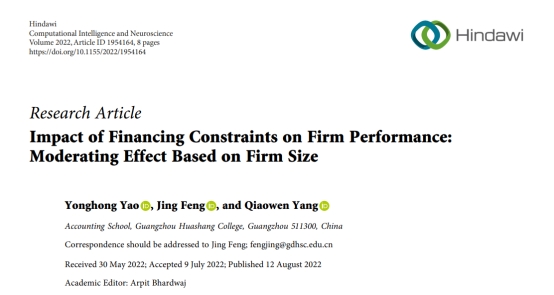 近日,会计学院青年教师姚永红(第一作者)、冯婧(通讯作者)、杨俏文合作发表了题为“Impact of Financing Constraints on Firm Performance:Moderating Effect Based on Firm Size”(企业规模对融资约束和企业绩效的调节效应研究—基于沪深A股上市公司的实证分析)的论文。该论文发表于《Omputational Intelligence and Neuroscience》期刊,该期刊属于SCIE检索期刊,最新影响因子为3.12,是中科院3区期刊。