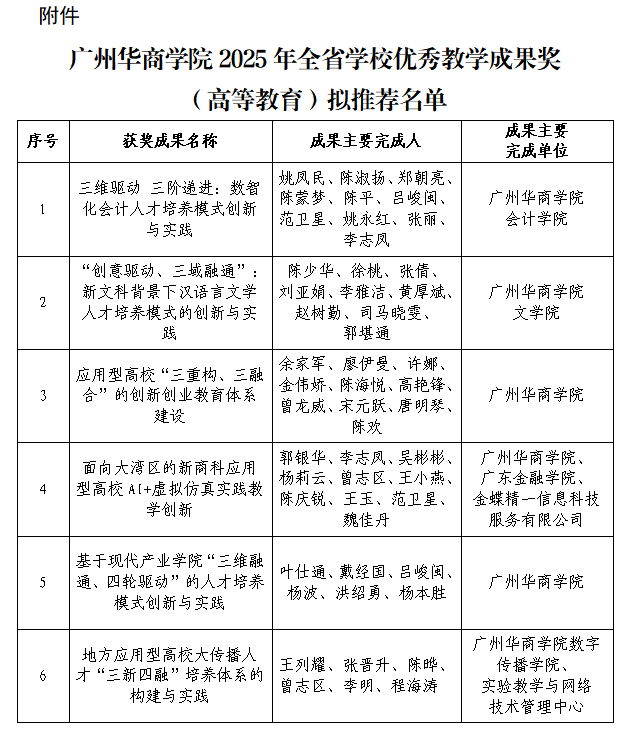 根据《关于开展全省学校优秀教学成果奖评审工作的通知》(粤教人函〔2025〕23号)文件精神,学校组织开展了2025年全省学校优秀教学成果奖(高等教育)遴选推荐工作。经二级单位申报、教务处审核、校内外专家评审及教学指导委员会审议等程序,遴选出6项成果申报2025年全省学校优秀教学成果奖(高等教育),现将拟推荐成果名单予以公示,详见附件。